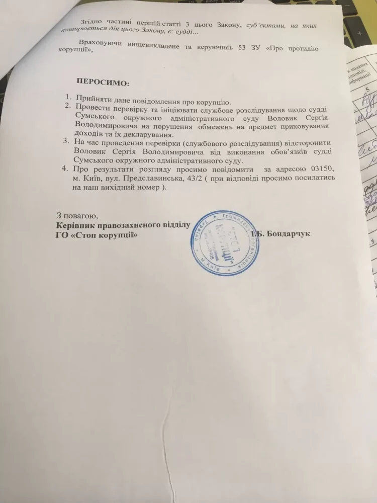 Яка ж роль голови Сумського окружного адміністративного суду Сергія Воловика. Як ми з’ясували, він не лише розглядає деякі справи фірм Зайця, а й може впливати на своїх колег. Втім, звернемося до мови фактів. Офіційно ми знайшли кілька справ, які особисто розглядав Воловик. Усі вони заперечуються чи оспорюються в апеляційних інстанціях.