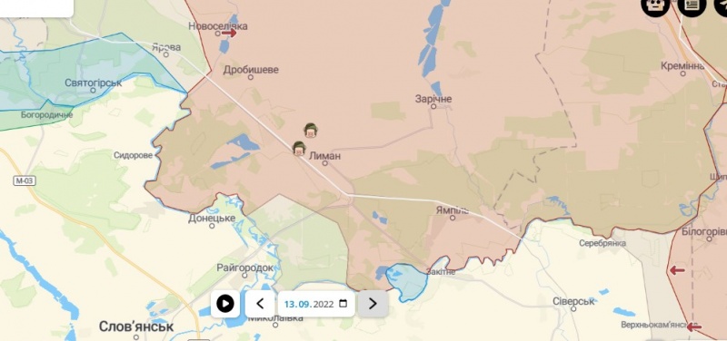 Згідно з картою, біля Лимана Донецької області, порівняно зі вчорашнім днем, розширилася "сіра зона". Ще вчора вказана територія була під контролем росіян. Бої за місто тривають.