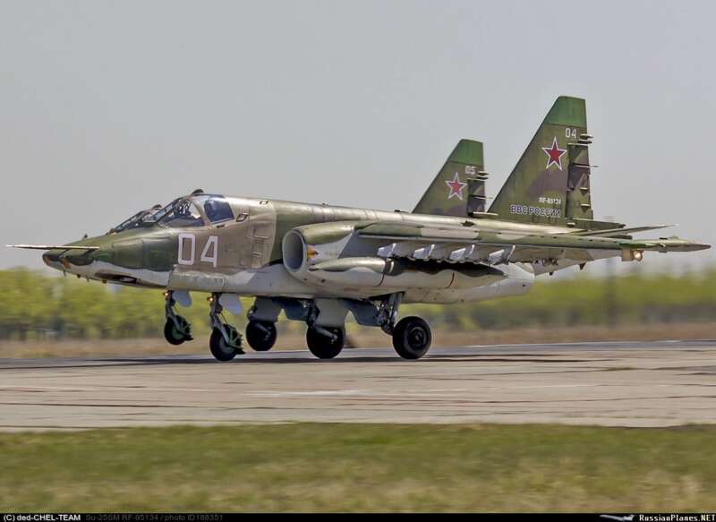 Зправа - рашистський Су-25СМ з бортовим номером 04 "Синій" RF-95134, що був збитий під час наступу ЗСУ на Харківщині у вересні 2022 року, фото ілюстративне