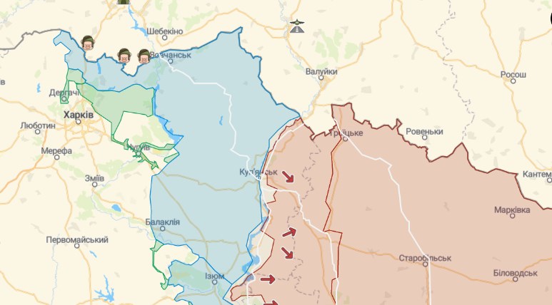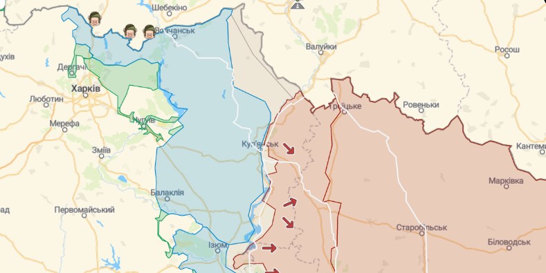 За даними карти, відбулася зміна на Харківському напрямку на користь ЗСУ. Українські військові зайняли частину території, яка ще вранці перебувала у "сірій зоні", за неї ще вранці точилися бої. Але за даними зараз окупанти продовжують відступати.