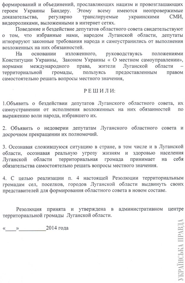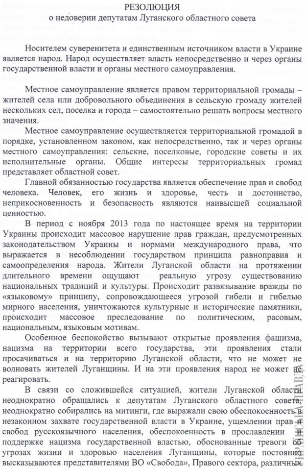 Причина изложена в проекте резолюции, подготовленной сценаристами: "...Жители Луганской области неоднократно обращались к депутатам Луганского областного совета, собирались на митинги, где выражали свою обеспокоенность в незаконном захвате государственной власти в Украине (...) Избранные нами, народом Луганской области, депутаты игнорируют законные требования народа и самоустранились от выполнения возложенных на них обязанностей".