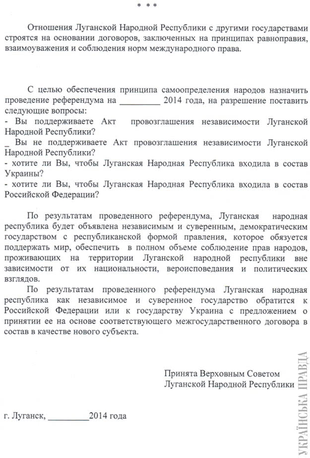 Тут же отмечается, что попытки центральной киевской власти они рассматривают как антизаконные. "Какие-либо насильственные действия против национальной государственности Луганской Народной Республики со стороны других государств, со стороны каких-либо политических партий, общественных организаций, формирований или отдельных лиц преследуются законом".