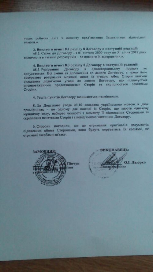 У разі порушення цього пункту «Укртранснафта» зобов’язувалася платити 0,1% від вартості нафти за кожен день роботи нафтопроводу поза домовленостями, а на 30-й день прострочення ще й додаткові 7%. Також ця угода продовжувала дію базового договору до 31 січня 2019 р. Документом, зокрема, закріплена неможливість одностороннього розірвання договору, а також внесення змін до угоди.