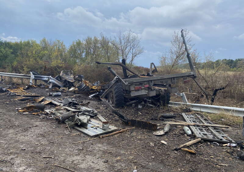 Від Харкова до звільненого Ізюма дві години їзди розбитими дорогами повз поля з незібраною пшеницею. Обабіч траси – спалена російська бронетехніка і трупи російських солдатів, які ще також не встигли прибрати.