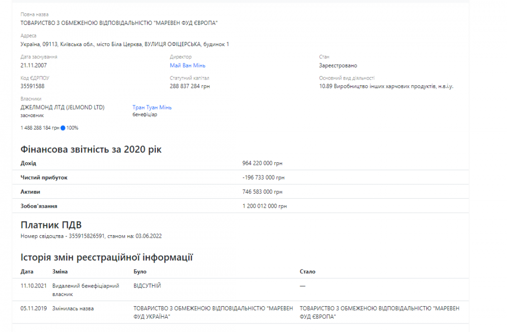 Зокрема, «Маревен Фуд Європа» 27 липня змінила кінцевого бенефіціарного власника на кіпрську Jelmond LTD засновником якої вказаний громадянин В’єтнаму Тран Туан Мінь.. Таким чином, слідчий продовжує, що компанія має відношення до російського капіталу, а тому існує високий ризик у прийнятті рішень керівництвом товариства на шкоду державній безпеці України. Суд вже наклад арешт на завод. Зміну власників також перевіряютьу АМКУ.