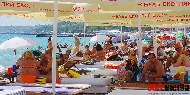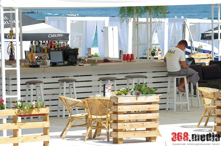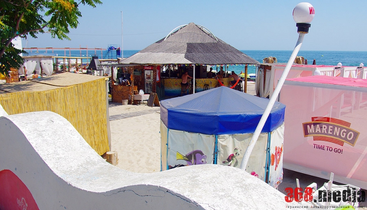 Третий уровень «благоустроенности» – это выход на песок: к палатке с зоной отдыха, впритык к бетонной стене, отделяющий склон от песка, пристраивается некое временное сооружение. Этим шагом подразумевается, что клиентура «наливайки» уже настолько платежеспособна, что ассортимент можно расширить до молочных коктейлей, которые потребителю принесет услужливая официантка. Пиво в таком случае дешевле 25 гривен стоить не будет, а у «наливайки» может даже появиться название, в достаточно степени броское и нелепое, чтобы привлекать искушенную публику.