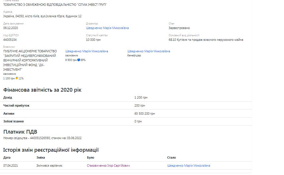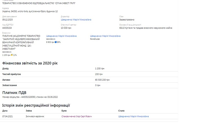 Там же знаходиться і ТОВ «Сігма Інвест Груп», власником якого до квітня 2021 року був Ігор Стаковиченко: