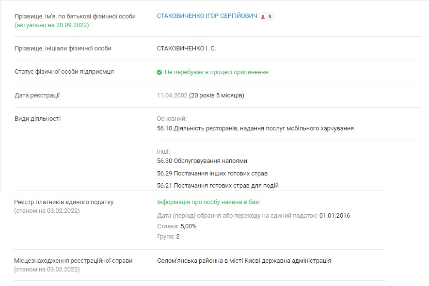 У тих же списках знаходиться і ФОП Ігор Стаковиченко, який, згідно з даними реєстру, займається ресторанним бізнесом: