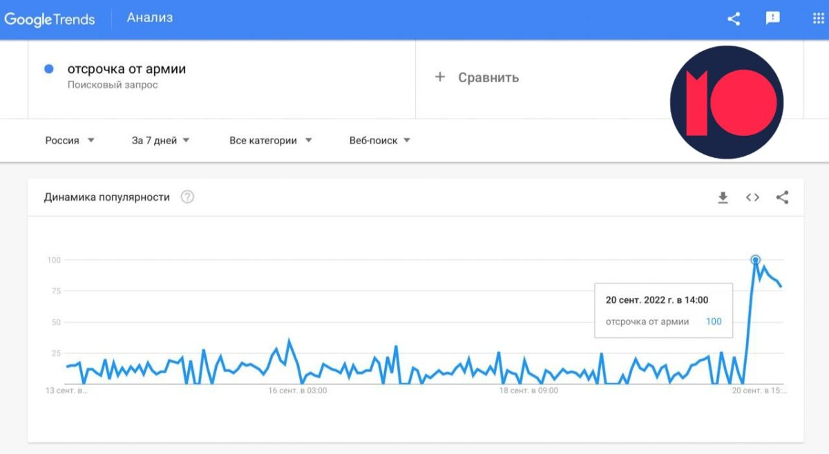 Цього ж дня росіяни почали “гуглити” тему відстрочок від армії. Пік припав на 13:00 після перших повідомлень про мобілізацію.
