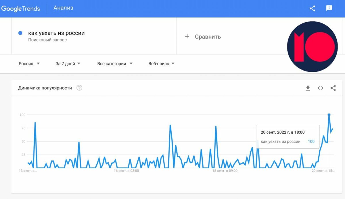 20 вересня індекс запитів у Google за словосполученням “Як виїхати з Росії” досяг максимуму. Це сталося на фоні припущень про майбутню мобілізацію в РФ та підготовку до незаконних “референдуму” на окупованих територіях України.