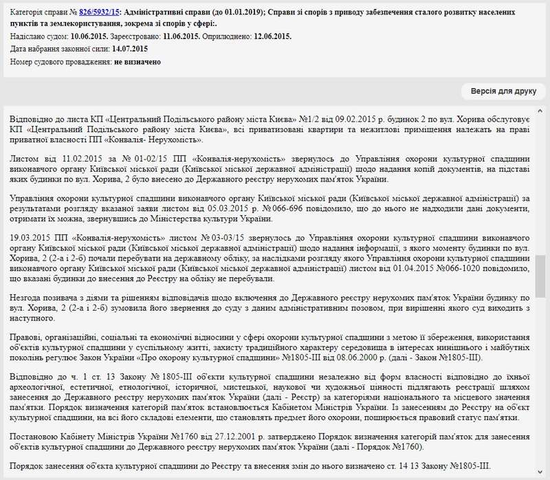 Як повідомляється в держреєстрі судових рішень, у липні 2007 року Подільська районна рада Києва затвердила перелік будинків, які знаходяться “в незадовільному технічному, непридатному для проживання, аварійному стані та потребують реконструкції". Мова йшла про об’єкти житлової нерухомості, які належать столичній громаді. До вказаного переліку було внесено у тому числі й будинок по вул. Хорива, 2-А. У березні 2009 року Подільська райрада доповнила цей перелік об’єктами, які знаходяться поруч зі вказаним будинком – по вул. Хорива, 2, літ. Б, В, Г, Д, Е, Ж, З. Загальною площа цих 8 об’єктів дорівнювала 3,1 тис. кв.м.