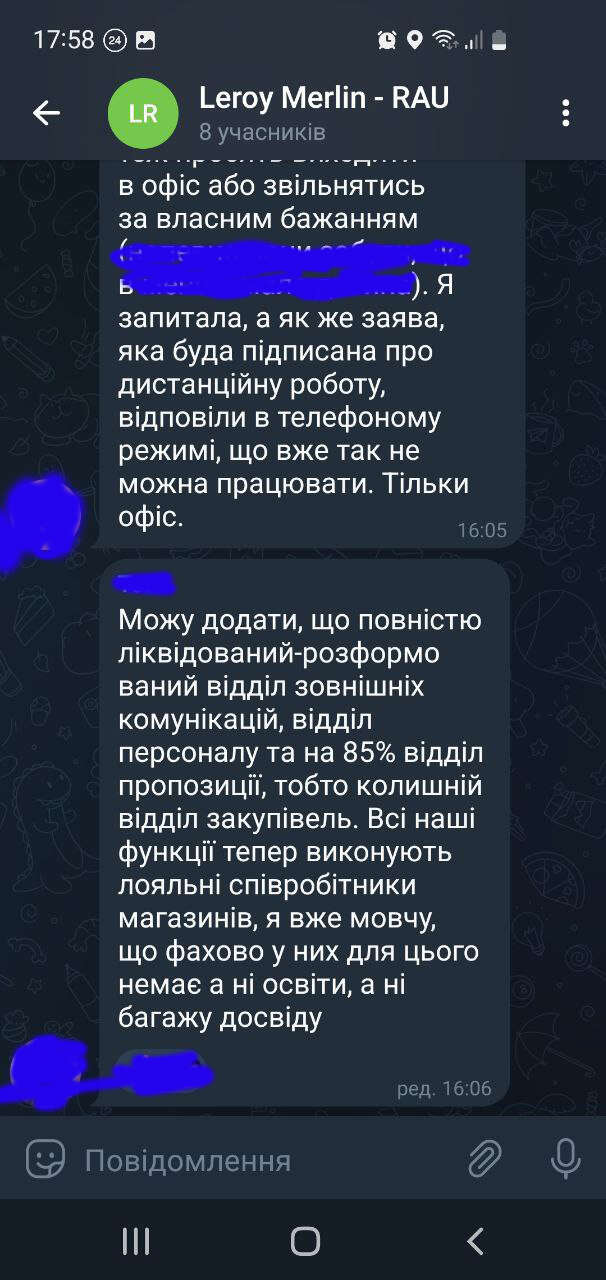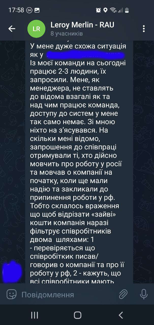 Його слова підтверджує ще один керівник відділу Leroy Merlin Ukraine. З його команди працює дві-три людини, проте самого, як менеджера, не ставлять до відома, як та над чим працює команда, доступу до систем немає. “Запрошення до співпраці отримували ті, хто мовчав про дії компанії з самого початку, коли ще мали надію та закликали до припинення роботи у рф. Перевіряється, що співробітник писав чи говорив про компанію та про її роботу у росії”.