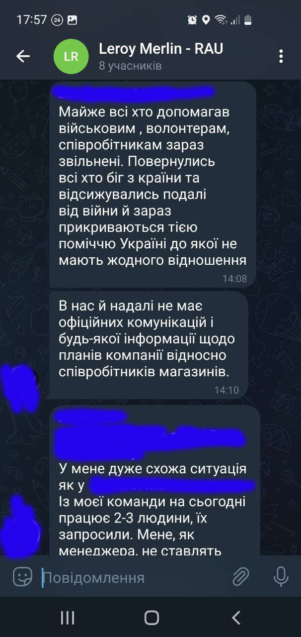 Зі співробітниками Leroy Merlin Ukraine проводять співбесіди. В компанії залишаються лише ті, хто публічно не задає питання до керівництва з приводу продовження роботи мережі у Росії.