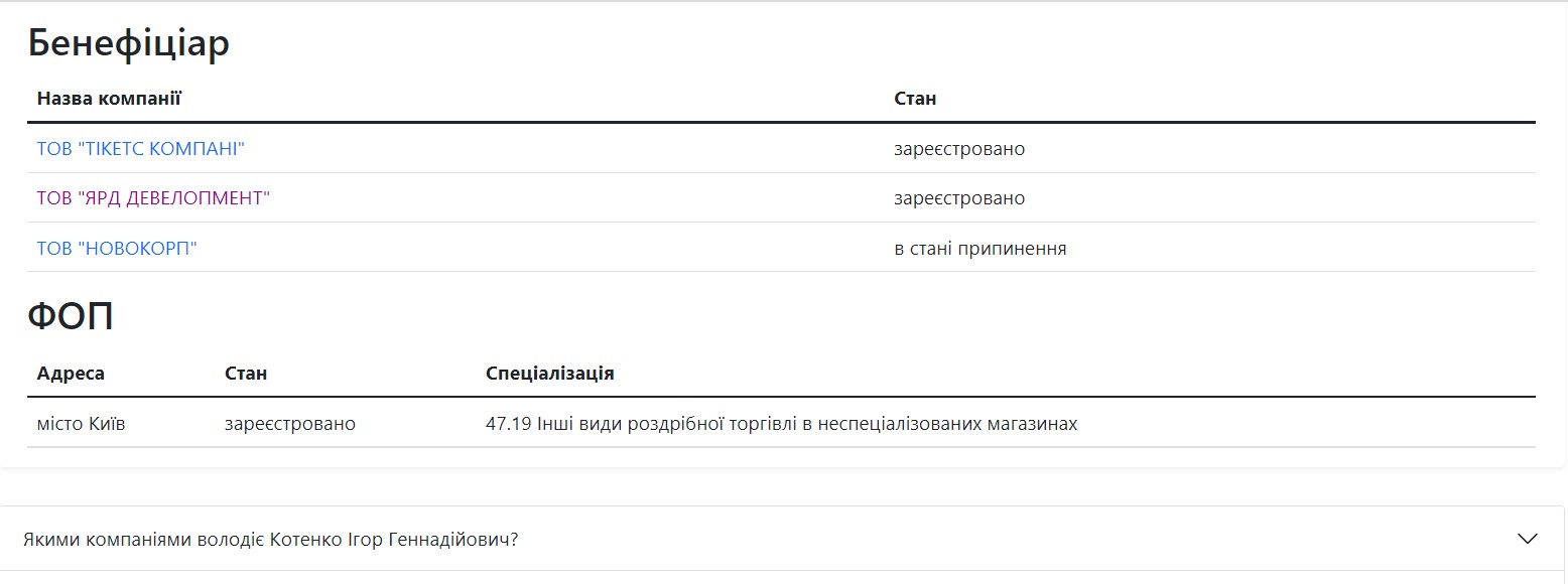 Ігорю Котенку належать ТОВ «Тікетс компані» та ТОВ «Новокорп», він також є ФОП: