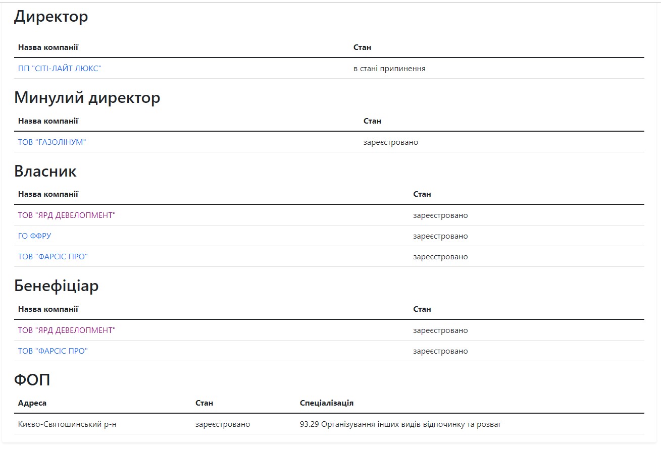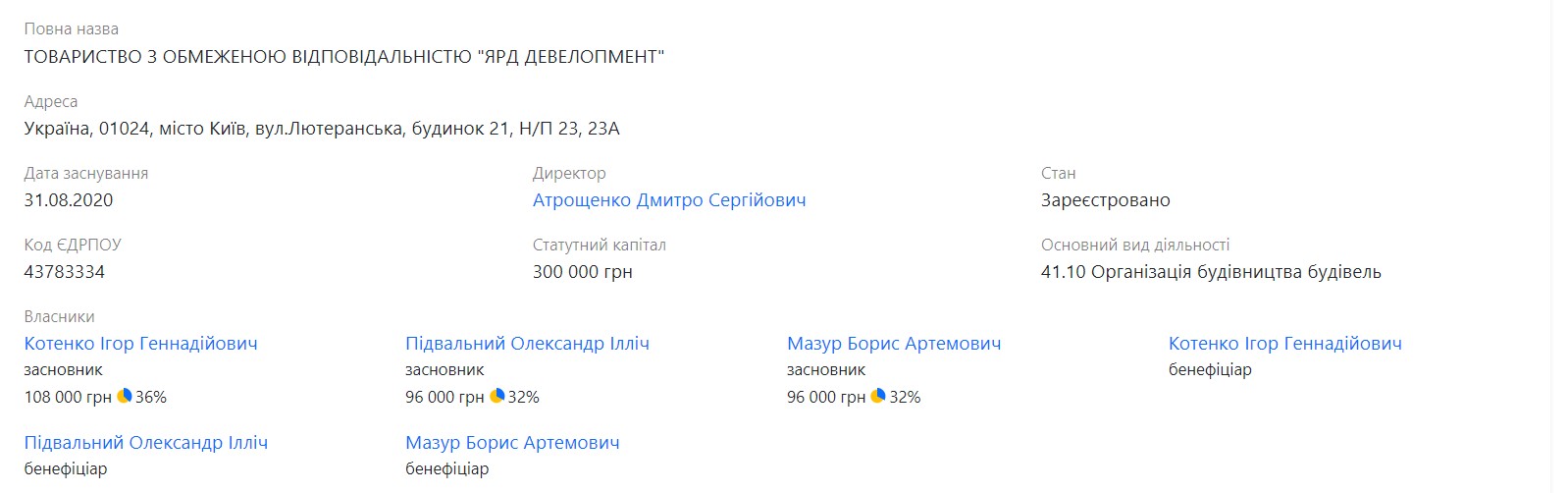 Щодо решти фігурантів кримінальних справ – Ігоря Котенка, Олександра Підвальнього та Бориса Мазура, які є співвласниками ТОВ «Ярд Девелопмент», то, крім Мазура, вони мають ще по кілька фірм.
