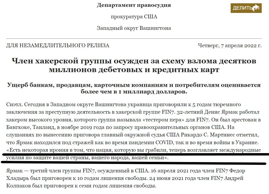 Йдеться про громадян України – Федора Олексійовича Хладира (Гладира), Дмитра Валерійовича Федорова, Андрія Колпакова, Дениса Ярмака. Як випливає з обвинувального висновку, «члени плідної хакерської групи, широко відомої як FIN7 (також званої Carbanak Group і Navigator Group, серед іншого), брали участь у дуже складній шкідливій кампанії, націленій на більш ніж 100 американських компаній, переважно у ресторанах, іграх та готельний бізнес. FIN7 зламала тисячі комп’ютерних систем та вкрала мільйони номерів кредитних та дебетових карток клієнтів, а також конфіденційну та закриту інформацію, яку група використовувала або продавала для отримання прибутку. Лише у Сполучених Штатах FIN7 успішно зламала комп’ютерні мережі компаній у 49 штатах та окрузі Колумбія, викравши понад 15 мільйонів карток клієнтів із більш ніж 6 500 окремих торгових терміналів у більш ніж 3600 окремих офісах».