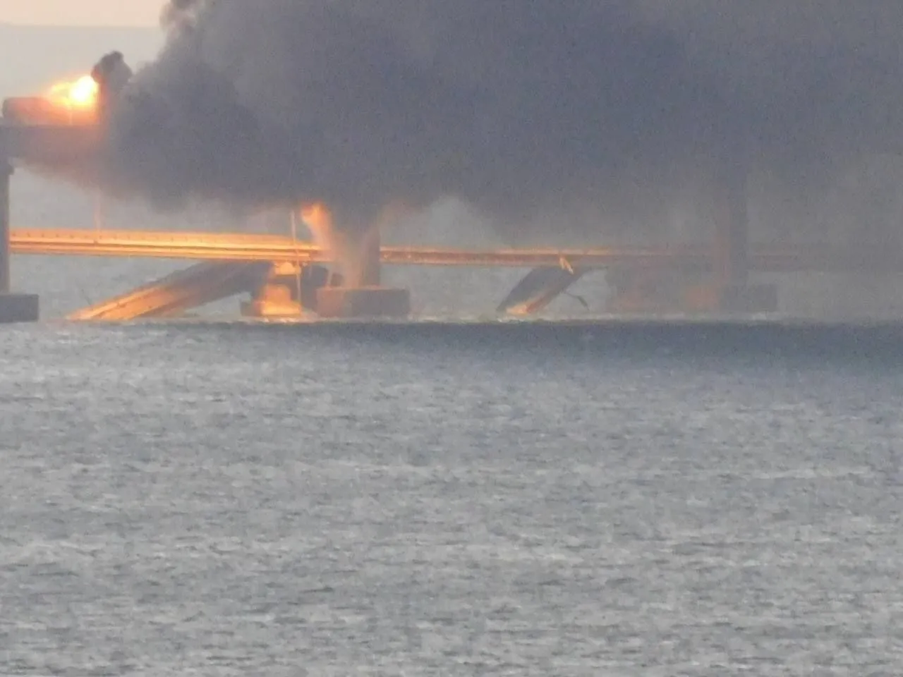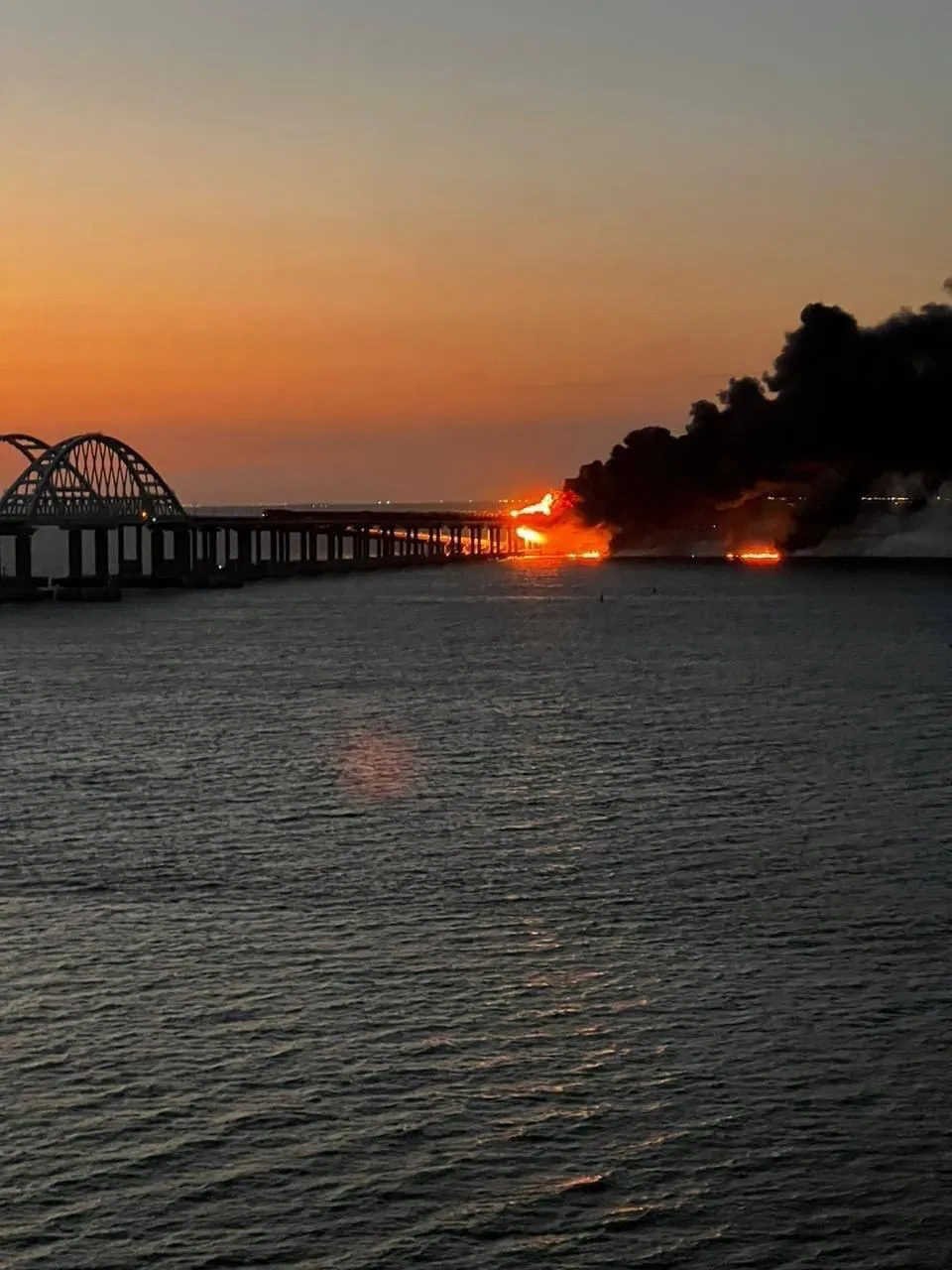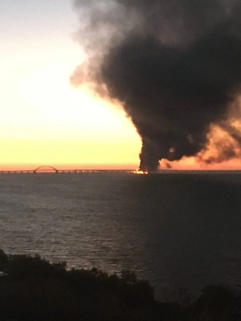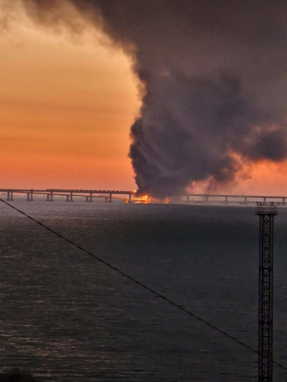 Внаслідок вибуху, який стався 8 жовтня о 6-й годині ранку, на Кримському мосту спалахнула сильна пожежа. Рух потягів і автомобілів мостом зупинили через пошкодження залізничного і автомобільного покриття. На місці працюють екстрені служби РФ.
