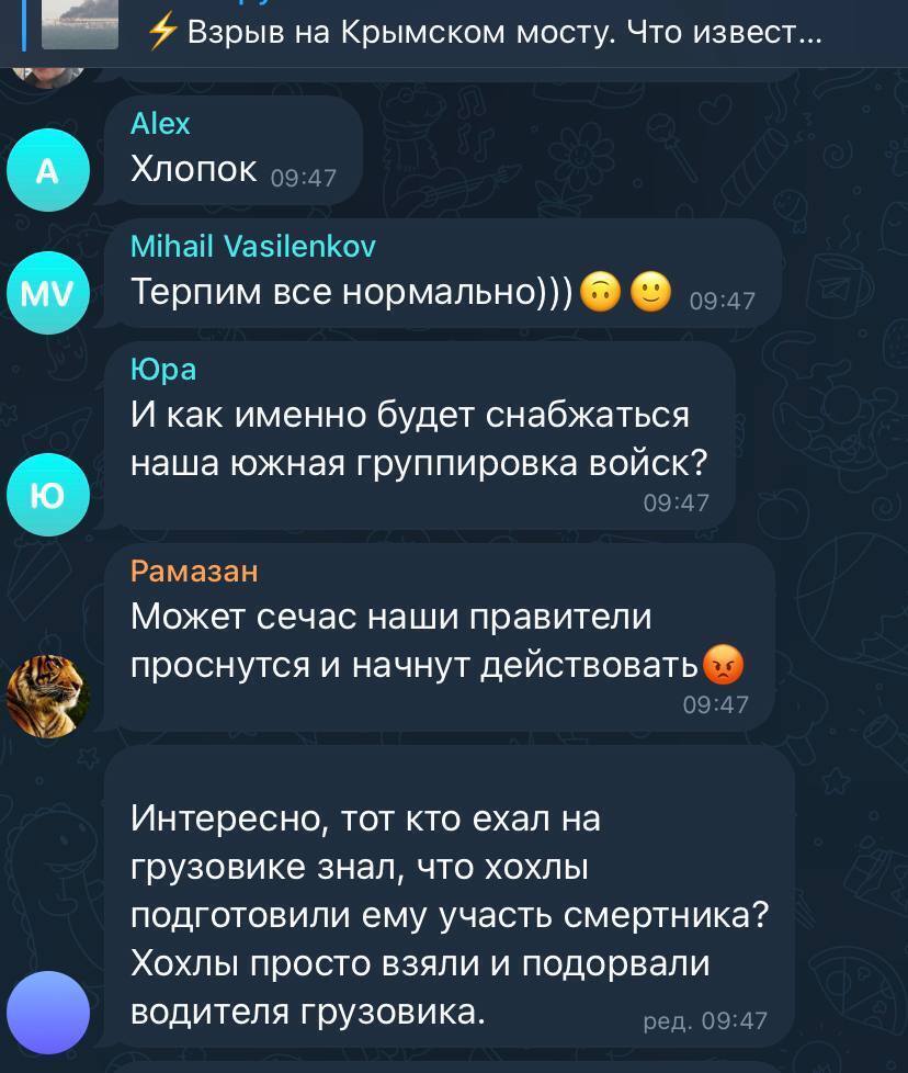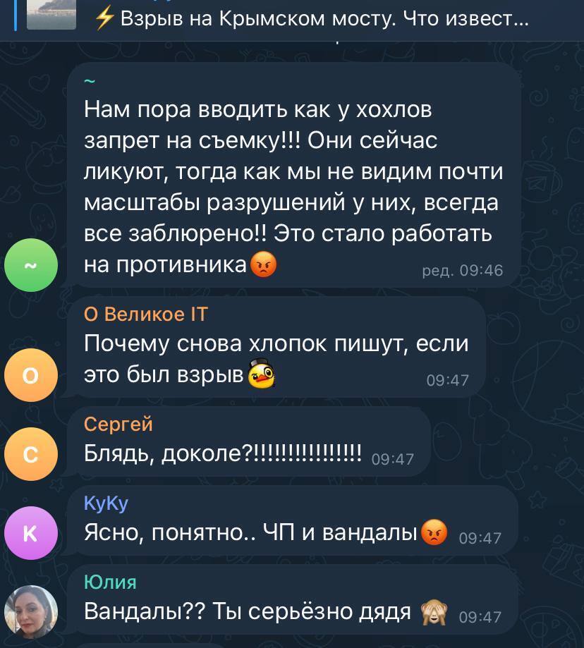 Реакція росіян істерична, вони знову спитали у коментарях "Где наше ПВО?", хоча за офіційною версією росЗМІ, вибух на мосту був результатом теракту.