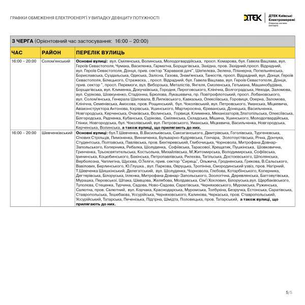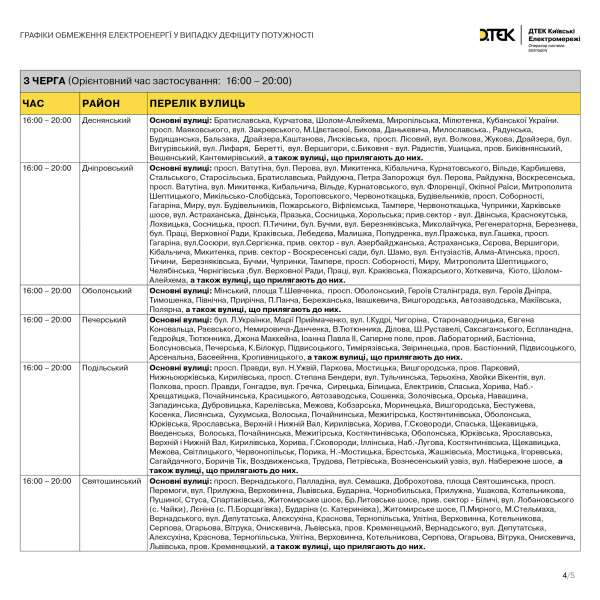 Прес-служба ДТЕК Київські електромережі ("Київенерго") повідомила, що тимчасово обмежується електропостачання до частини 3-ої черги та опублікували наступний графік:
