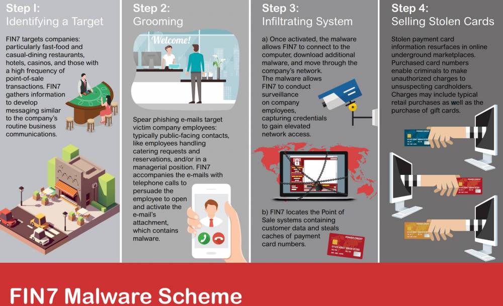 Ця злочинна організація налічує понад 70 осіб, об’єднаних у підрозділи та групи. Деякі були хакерами, інші розробляли шкідливе програмне забезпечення, встановлене на комп’ютерах, а треті створювали шкідливі електронні листи, які змусили жертви заразити системи їхніх компаній. Зловмисники брали участь у надскладній кампанії зловмисного програмного забезпечення для атаки на сотні американських компаній, переважно в ресторанному бізнесі, індустрії ігор та готельному бізнесі. FIN7 зламав тисячі комп’ютерних систем і викрав мільйони номерів кредитних та дебетових карток клієнтів, які використовувалися або продавалися з метою отримання прибутку.