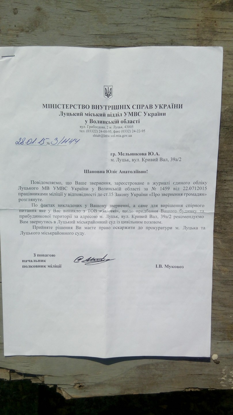 Натомість у відповіді з луцького міськвідділу міліції за підписом Ігоря Муковоза Юлії рекомендують звернутися із цивільним позовом у суд.