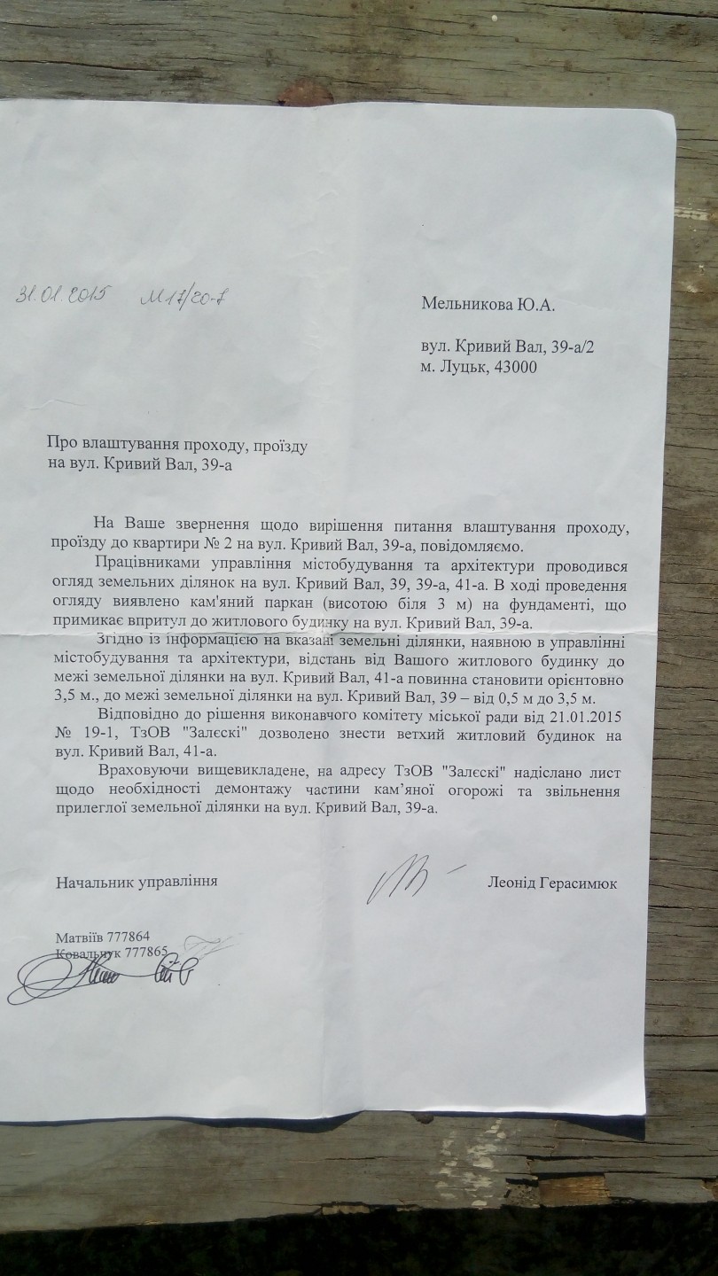 Як ідеться у відповіді начальника управління архітектури Луцької міської ради Леоніда Герасимюка від 31 січня 2015 року, «на адресу ТзОВ «Залеєскі» надійшов лист щодо необхідності частини кам’яної огорожі та звільнення прилеглої земельної ділянки на вул. Кривий Вал, 39-а». Проте станом на 15 серпня ніхто демонтувати огорожу не збирався.
