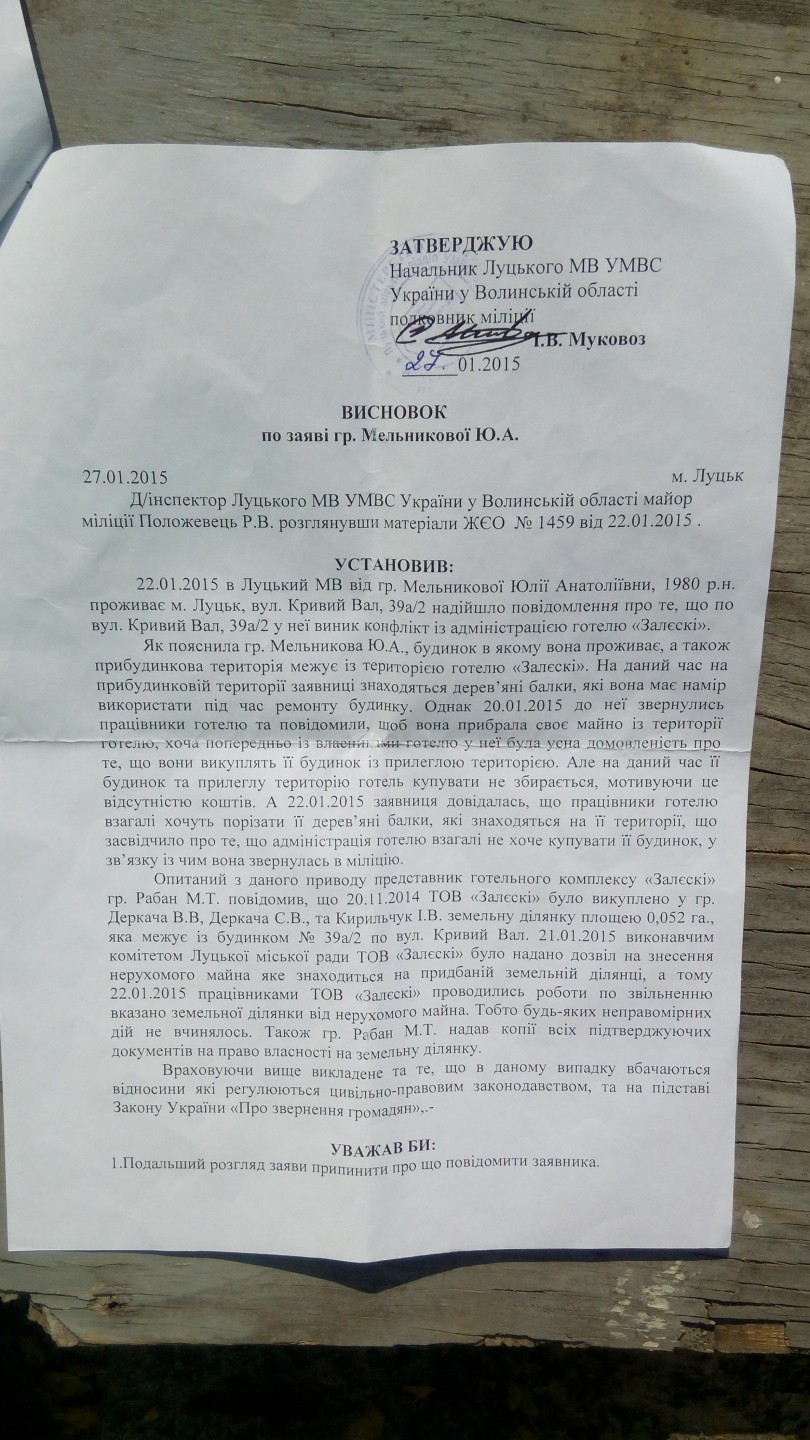 Представник «Залєскі» – адвокат Микита Рабан пояснив міліції, що 20 листопада 2014 року вони викупили у сусідів земельну ділянку за адресою Кривий Вал, 39а/2 площею 0,052 га. Тому згідно із документами, які він надав, балки таки знаходилися на територію готелю і їх доведеться прибрати.