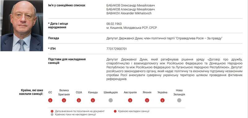 Що ж стосується іншого учасника тріумвірату керманичів ОЗУ "Лужники" - 59-річного депутата Держдуми РФ Олександра Бабакова, то обмежувальні заходи відносно нього було накладено у вересні 2022 року указом президента України №637/2022.