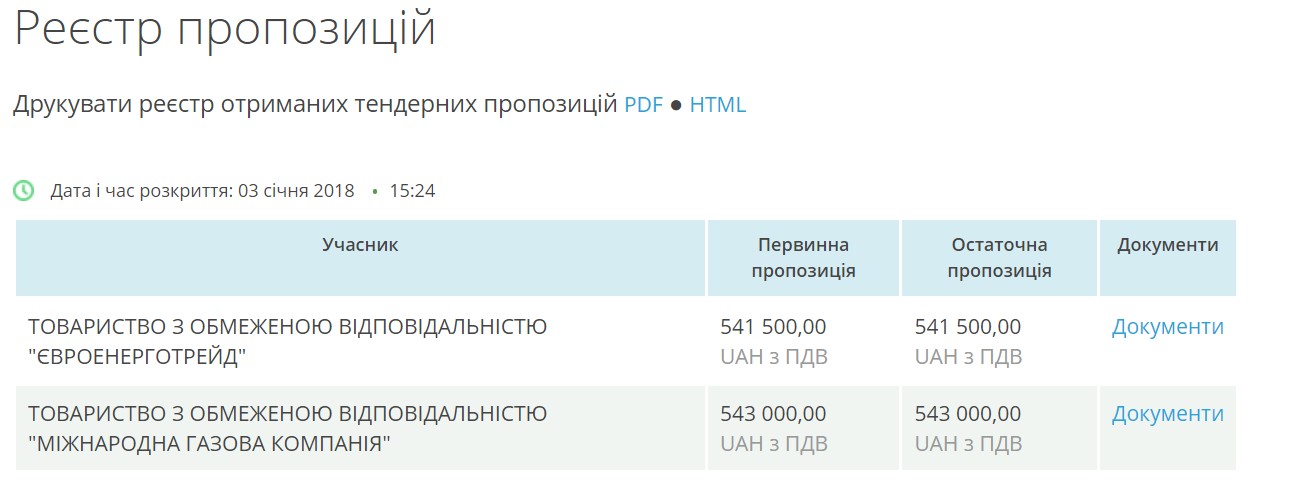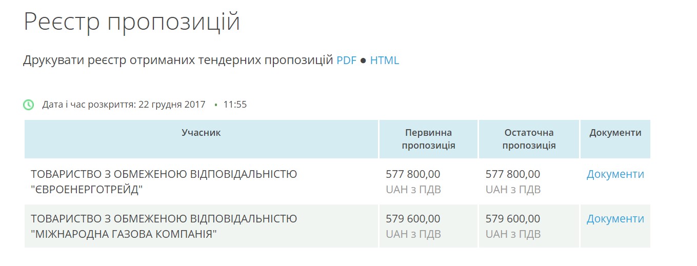 Як випливає з вивчення тендерної документації із системи Prozorro, ТОВ «Міжнародна газова компанія» та ТОВ «Євроенерготрейд» мають дивну звичку брати участь в тих самих тендерах на держзакупівлі газу, де перша фірма постійно пропонує трохи гірший варіант, ніж друга, і тому програє . Ось перший приклад такої дивності: