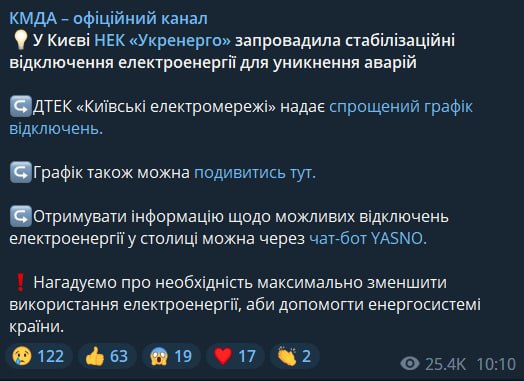 У вівторок, 25 жовтня, у Києві знову відключатимуть світло. "Укренерго" запроваджує стабілізаційні відключення електроенергії, щоб запобігти аваріям.