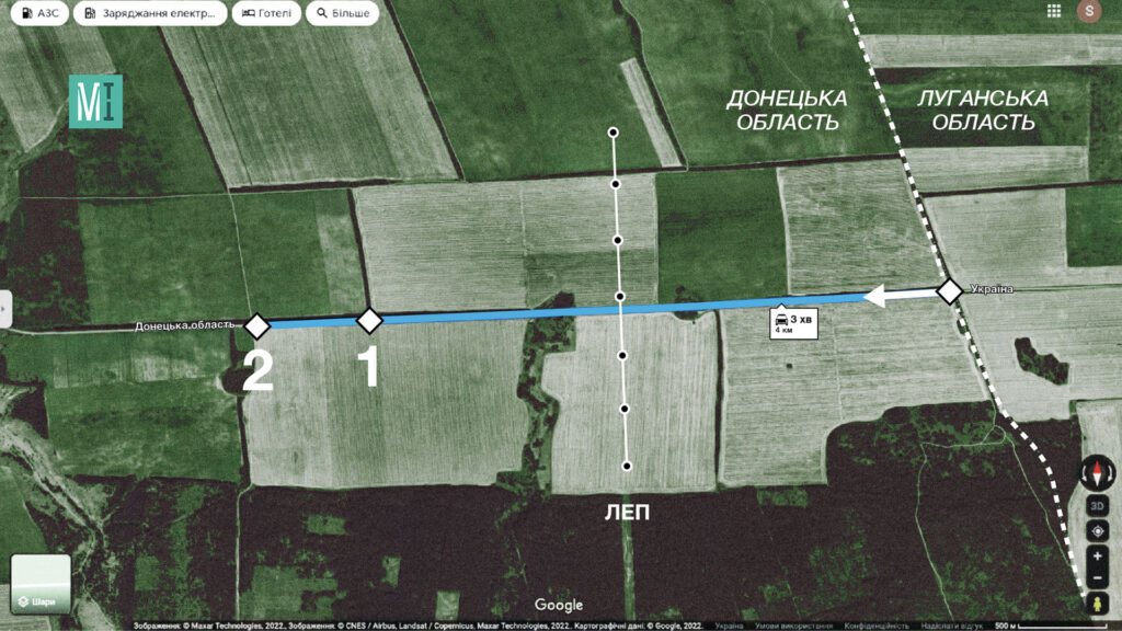 Відстань від початкової точки, яка на мапі позначена стрілкою, до точки 2 складає 4 км, до точки 1 — 3 км. Це приблизна відстань, про яку говорить Олександр Дробот. Відповідно, розстріл автомобіля стався в межах ділянки, позначеної цифрами 1 і 2.
