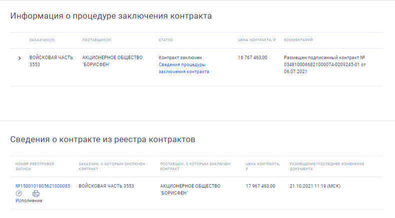 АО «Борисфен» – 90% у «Лосиного острова», 10% напряму у власності ОАО «Мотор Сич». Сталий постачальник і підрядник Росгвардії та її авіапарку. Ми подивились закупівлі з початку 2019-го до кінця 2021 го – за три останні роки перед початком вторгнення Росії. Незадовго до початку вторгнення закупівлі оборонного призначення в Росії частково утаємничили – можливо лише побачити саме оголошення, а переможці приховані.