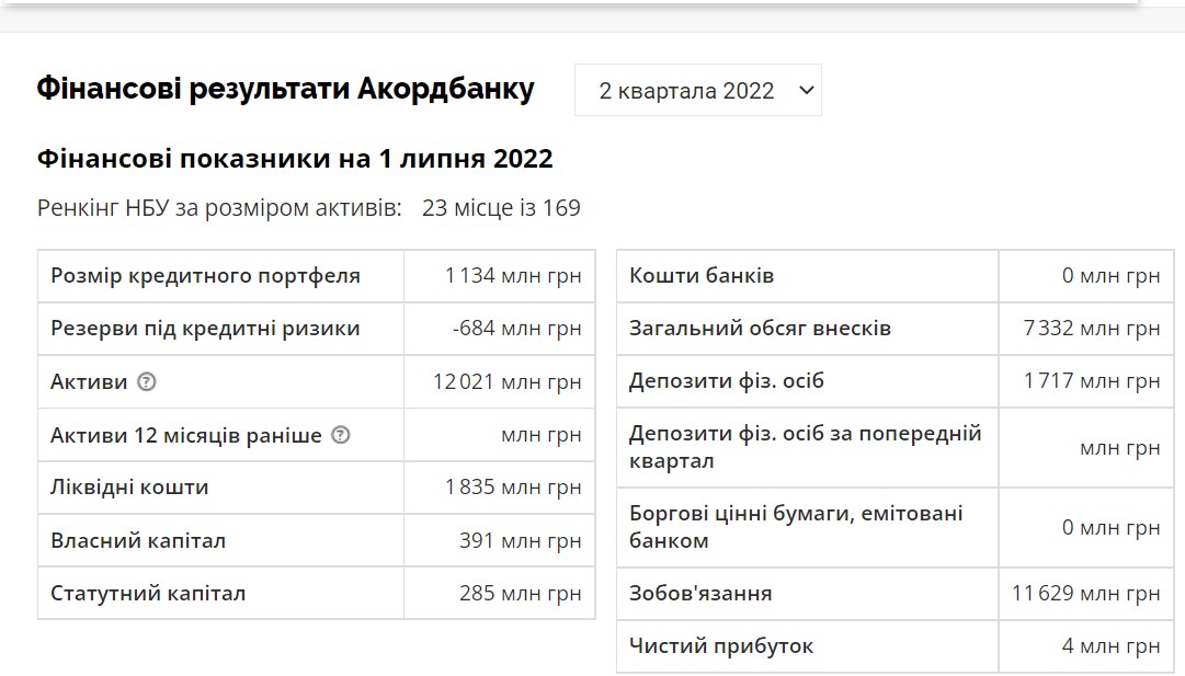 Це – офіційні результати роботи банку станом на 1 липня 2022 року. Як бачите, «Акордбанку» не вистачає майже сімсот мільйонів на покриття можливих кредитних ризиків.