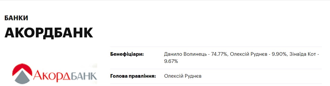 Кінцевим бенефіціаром «Акордбанку» є Данило Мефодійович Волинець – чоловік екс-міністра фінансів України та нинішнього посла нашої країни у США Оксани Маркарової. Мабуть, у Кирила Шевченка, який керував до НБУ державним Укргазбанком, та міністра фінансів Маркарова знайшлися спільні інтереси. Та й сам Волинець входить до наглядової ради державного «Ощадбанку». Що також дуже цікаво.