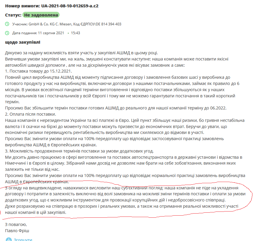 «Miesen GmbH & Co KG», Німеччина: «Наша компанія не піде на укладення договору і потрапить у залежність виключно від волі замовника на можливі зміни термінів поставки та оплати за умови додаткових угод, які є можливим інструментом для провокування корупційних дій та несумлінної співпраці. Дуже розраховуємо на співпрацю у прозорих та реальних умовах...»