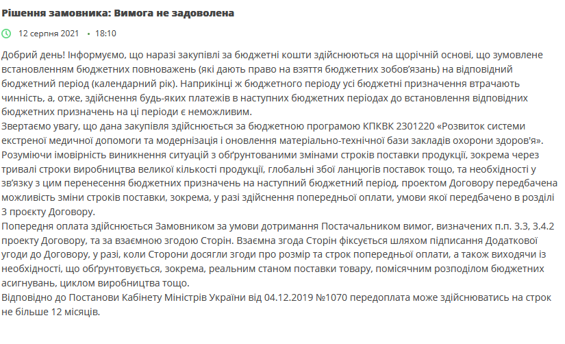 Але «МОЗУ» на всі претензії мала одну відповідь: ми можемо застосовувати дискрецію, ваші вимоги про гарантію авансу та продовження терміну поставки задовольняти не будемо.