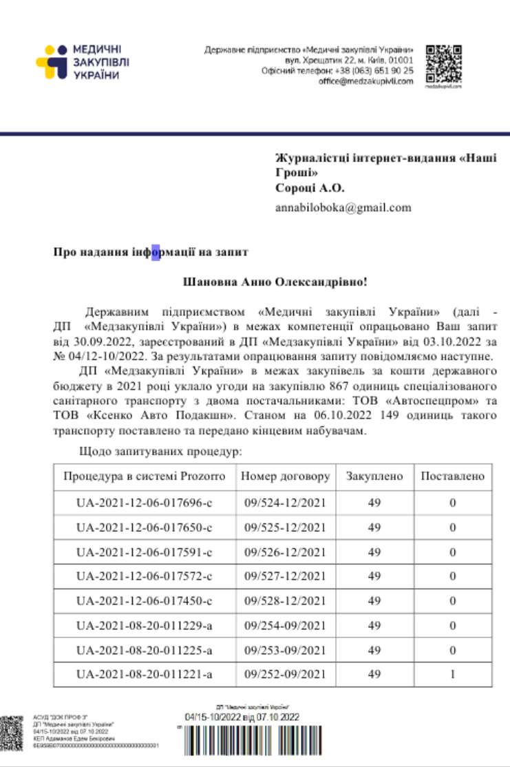 Беремо один із тендерів серпня 2021 року RU-2021-08-10-012727-a, за яким, згідно з відповіддю «МОЗ» на запит «Наших грошей», станом на 6 жовтня не було поставлено жодної машини.