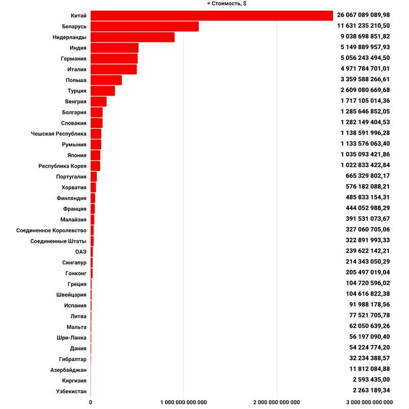 Топ-30 найбільших покупців російської нафти початку війни. Джерело: дані ФМС