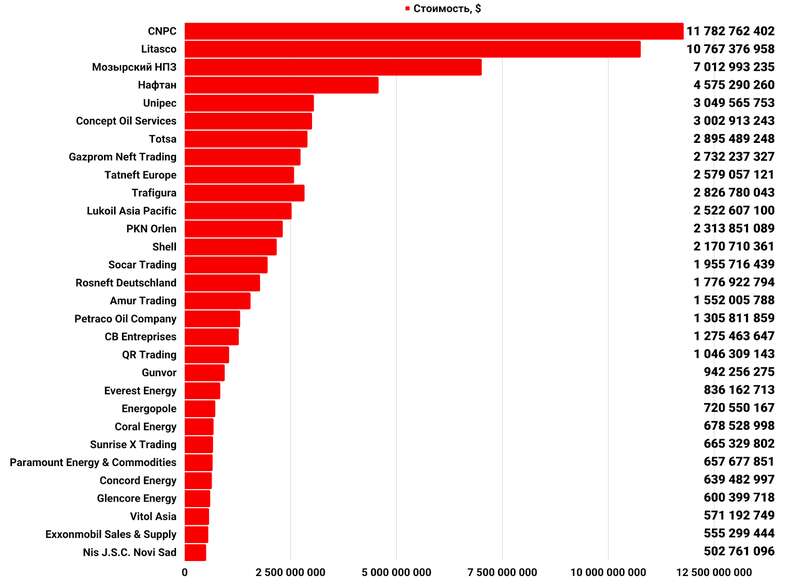 Amur Trading (загальний обсяг угод - $1,55 млрд) - дочірня структура одного з найбільших світових трейдерів Vitol (AmurTrading управляють топ-менеджери з Vitol, випливає з даних реєстру юросіб Швейцарії). Vitol у квітні пообіцяв до кінця року припинити закуповувати російську сировину. Обсяги поставок компанії справді падають: з початку війни Vitol перевіз нафти на $571,2 млн. Але Amur Trading лише збільшує закупівлі.