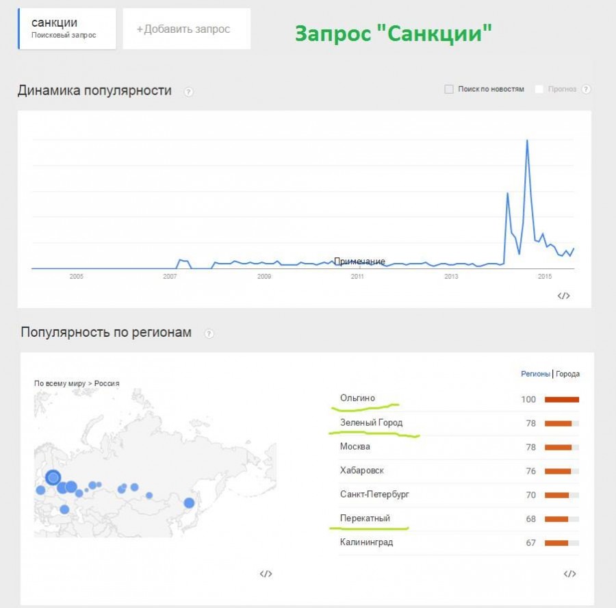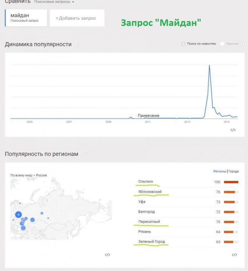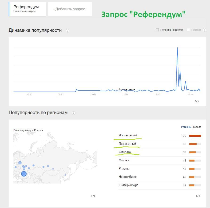 Почти в любых политических запросах фигурируют маленькие поселки Ольгино, Яблоновский, Перекатный и Зеленый Город. По интенсивности запросов они иногда обгоняют даже Москву и Санкт-Петербург!