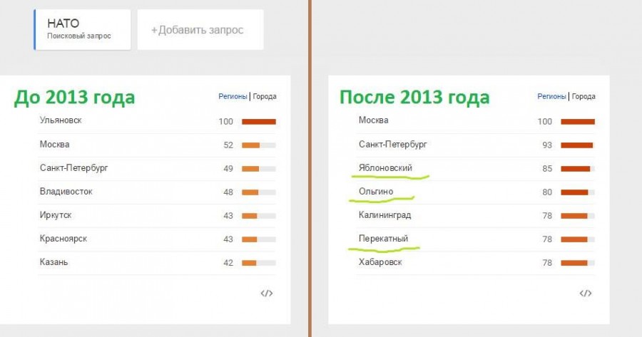 Например, посмотрев статистику по слову «НАТО» год легко заметить — до средины 2013 года больше всего эта тема интересовала жителей Ульяновской области, что не удивительно — в это время по СМИ как раз прокатилась информация об открытии в Ульяновске базы НАТО.