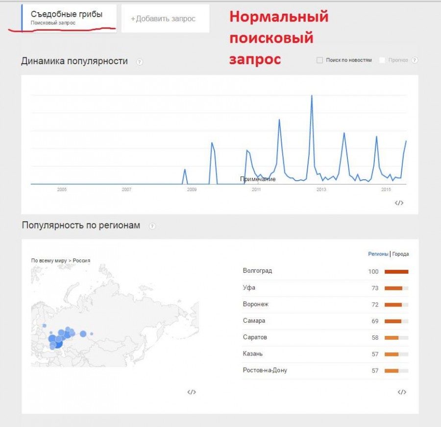 Например, легко узнать, что «Туризмом» очень часто интересуются в столице Бурятии Улан-Удэ и в Москве, «Съедобными грибами» — в Волгограде, а творчеством «Михаила Круга» — на родине, в Твери.