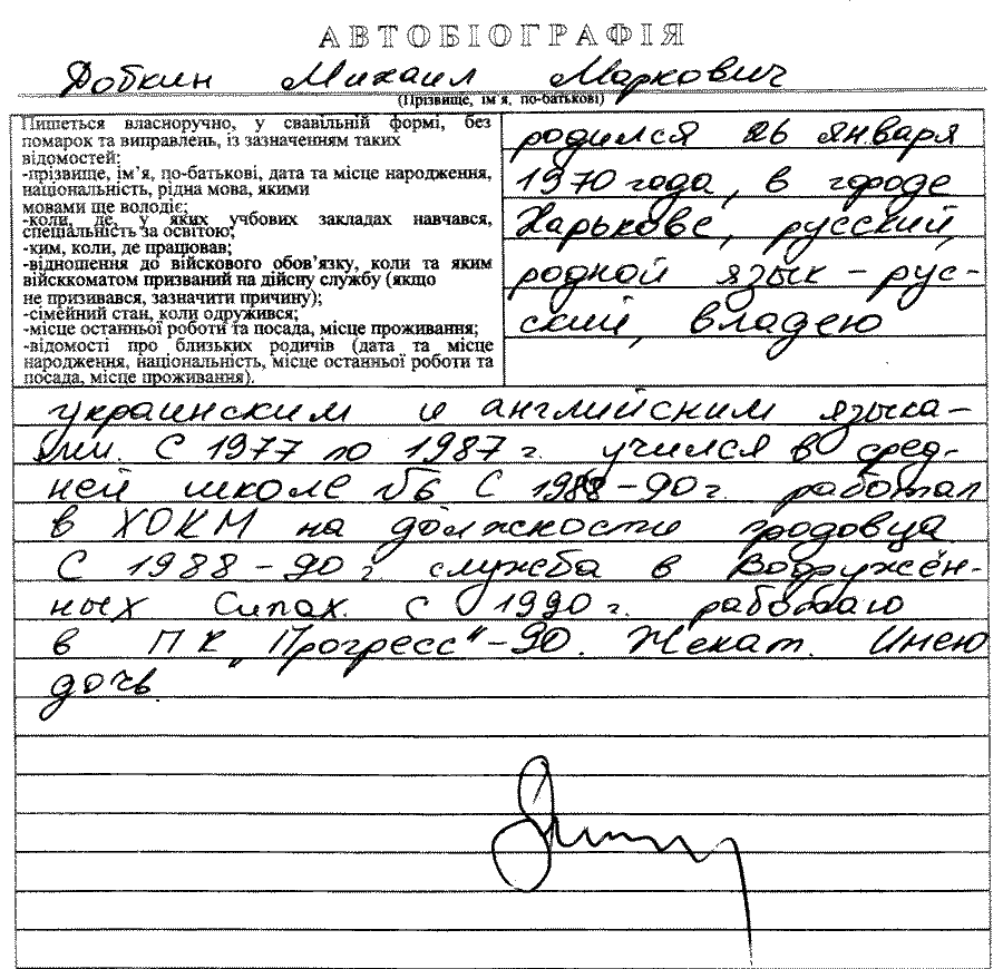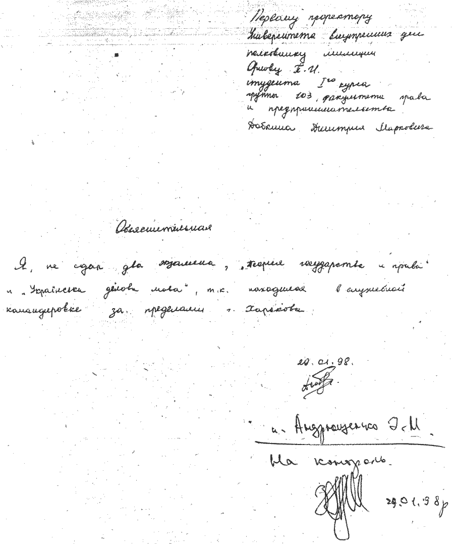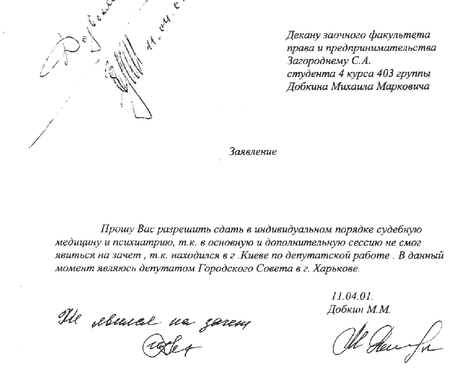 Действительно, 30 июля 1997 года он написал заявление в Харьковский национальный университет внутренних дел с просьбой разрешить ему сдачу вступительных экзаменов на заочное отделение факультета правоведения и предпринимательства по специальности «Правоведение». Здесь же стоит заметить, что подпись на заявлении – не добкинская, графа «Оплату обучения буду производить» не заполнена.