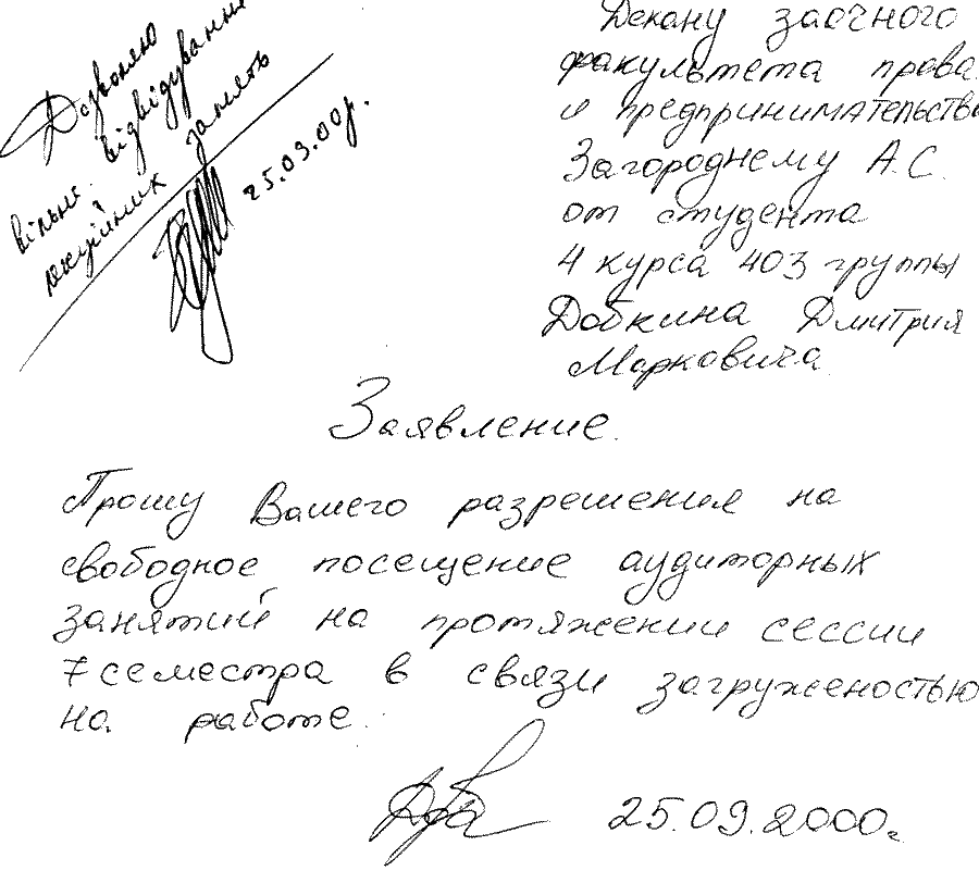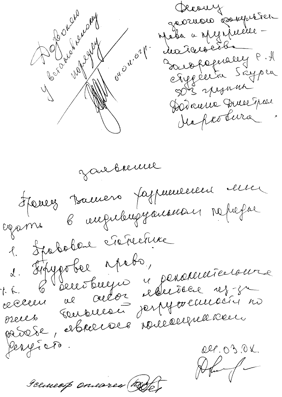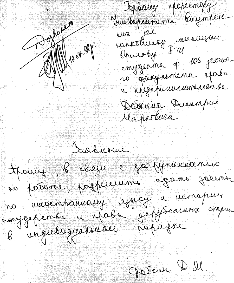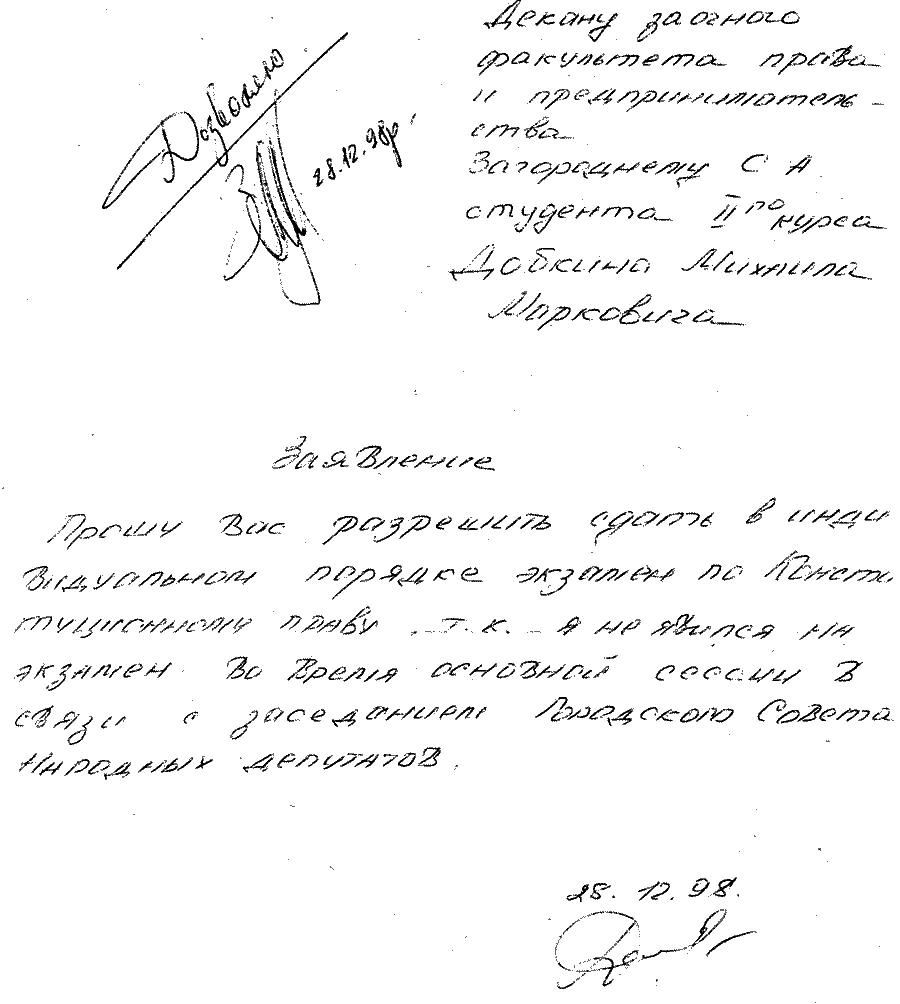 Практически все сессии Михаил Маркович успешно прогулял, но диплом все же получил. Но глядя на эти его заявления, невозможно не заметить и другое. На всех заявлениях стоят совершенно разные подписи. То ли психика кандидата Добкина меняется не реже двух раз в год, то ли он лаже не утруждал себя написанием заявлений, поручая сей тяжкий труд своей прислуге. Но какова же его настоящая подпись? Наверное, та, что была поставлена на анкете при получении паспорта, когда у него не было еще слуг и стойкого нежелания учиться: