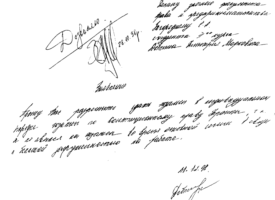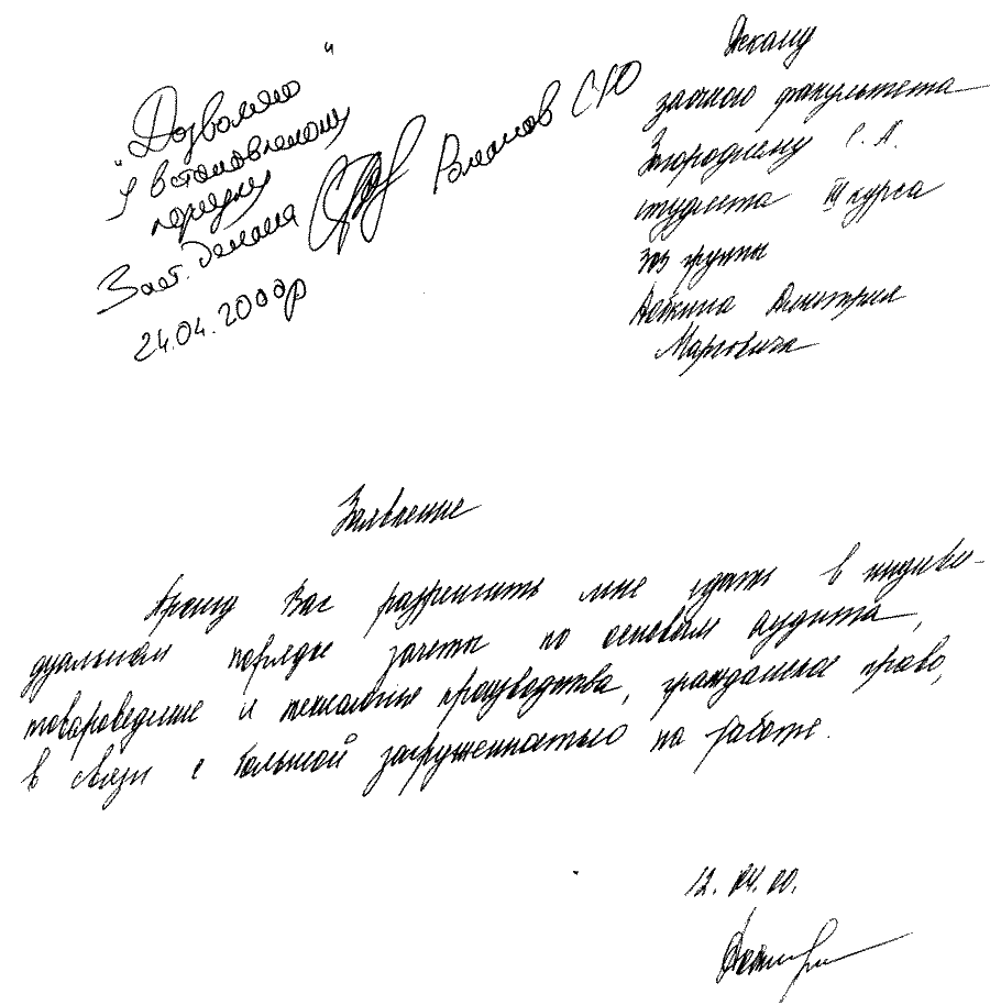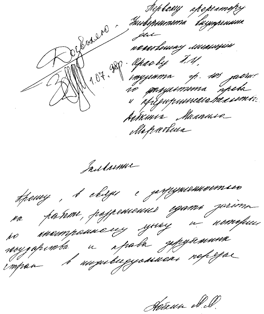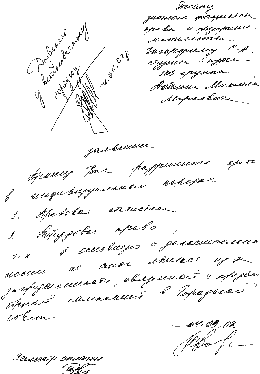 Практически все сессии Михаил Маркович успешно прогулял, но диплом все же получил. Но глядя на эти его заявления, невозможно не заметить и другое. На всех заявлениях стоят совершенно разные подписи. То ли психика кандидата Добкина меняется не реже двух раз в год, то ли он лаже не утруждал себя написанием заявлений, поручая сей тяжкий труд своей прислуге. Но какова же его настоящая подпись? Наверное, та, что была поставлена на анкете при получении паспорта, когда у него не было еще слуг и стойкого нежелания учиться: