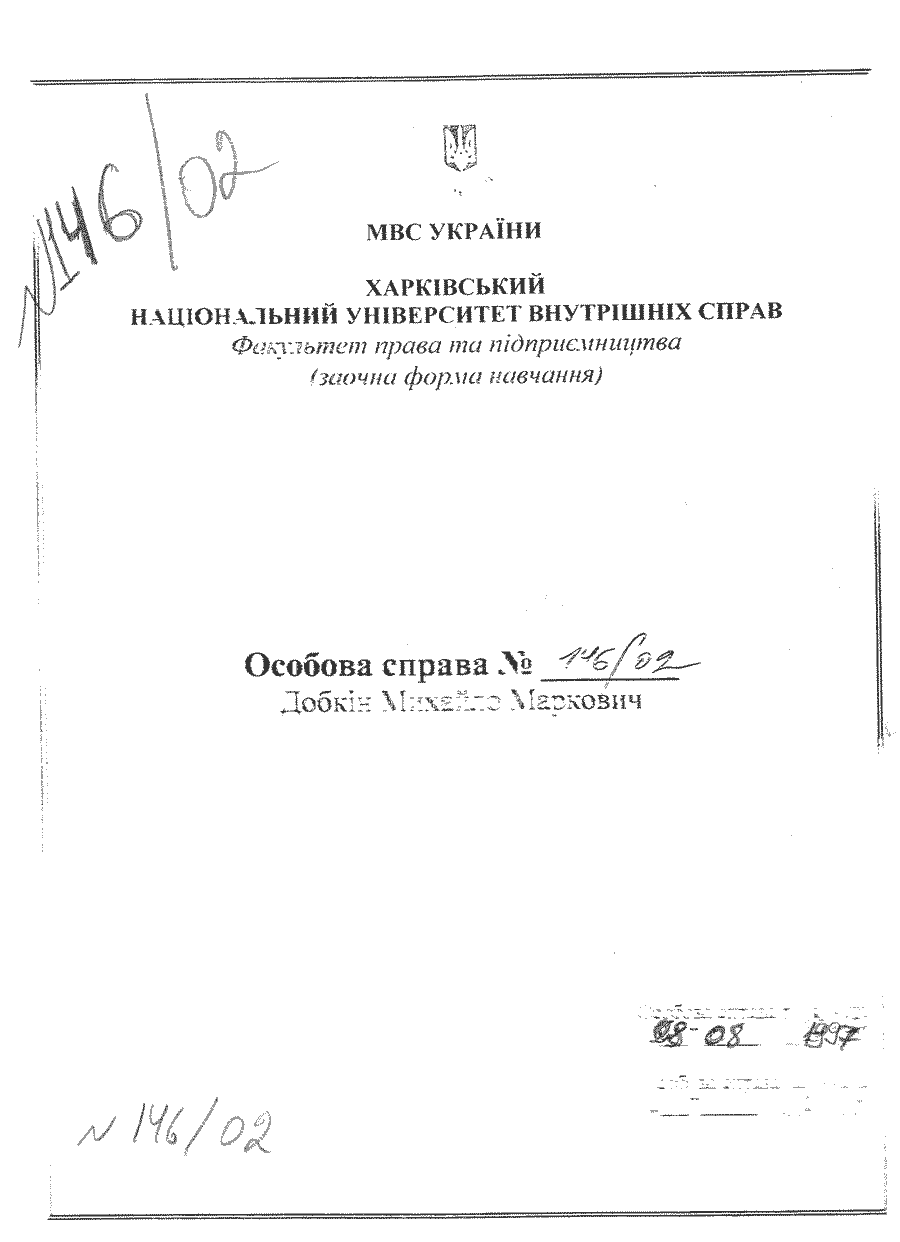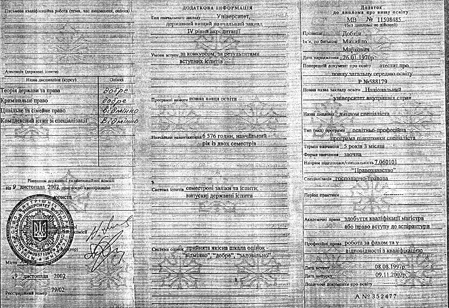 В личном деле № 146/02 Добкина М. М. отсутствуют обязательные копии диплома и приложение к диплому о высшем образовании. Копии этих документов находятся в личном деле Харьковского государственного экономического университета за 2004 год. В дипломе специалиста МВ №11508485 от 09.11.2002 г. и приложении к диплому о высшем образовании А №352477, регистрационный №79/02 от 09.11.2002 г. так и бросается в глаза подпись ректора: