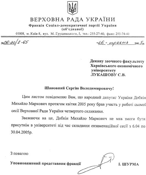 Что же до его депутатской деятельности, которая так мешала учебе, то проще всего посмотреть на даты заседаний Верховной Рады и регистрацию самого Добкина.