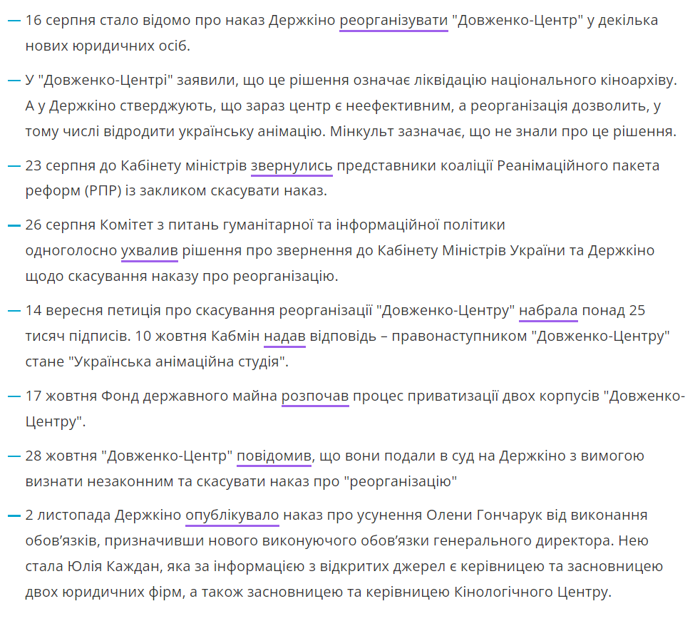 До того ж, висновку підштовхує і рішення про реорганізацію «Довженка-Центру» в кілька юридичних осіб. Зазвичай у такий спосіб «дерибанять» на частини активи, які неможливо вивести із державної власності. Водночас часто в процесі такої реорганізації «губляться» важливі документи.