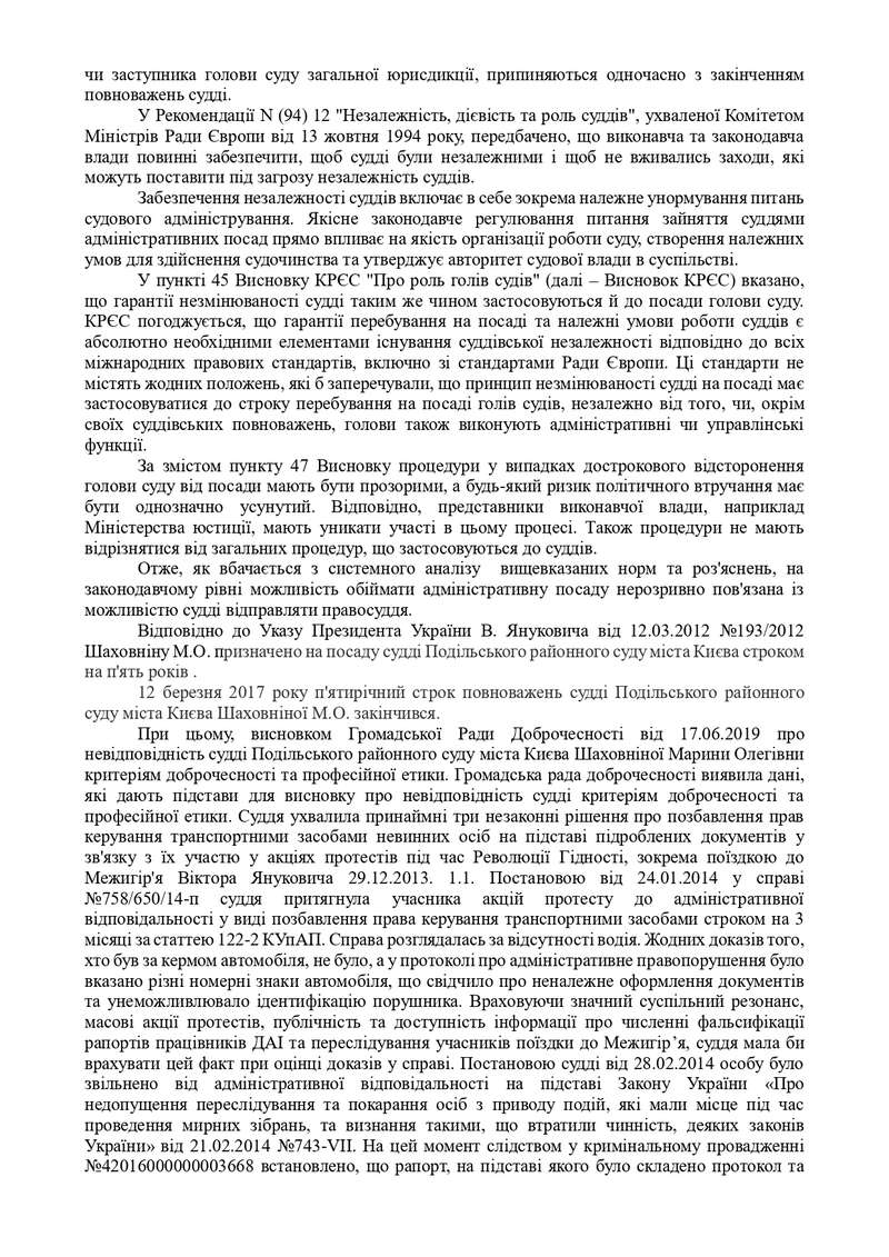 Заявники у листі чітко вказали, що «Відповідно до Указу Президента України В. Януковича від 12.03.2012 №193/2012 Шаховніну М.О. призначено на посаду судді Подільського районного суду міста Києва строком на п’ять років. До цього часу суддя Подільського районного суду міста Києва Шаховніна М.О. не була призначена на посаду судді безстроково.