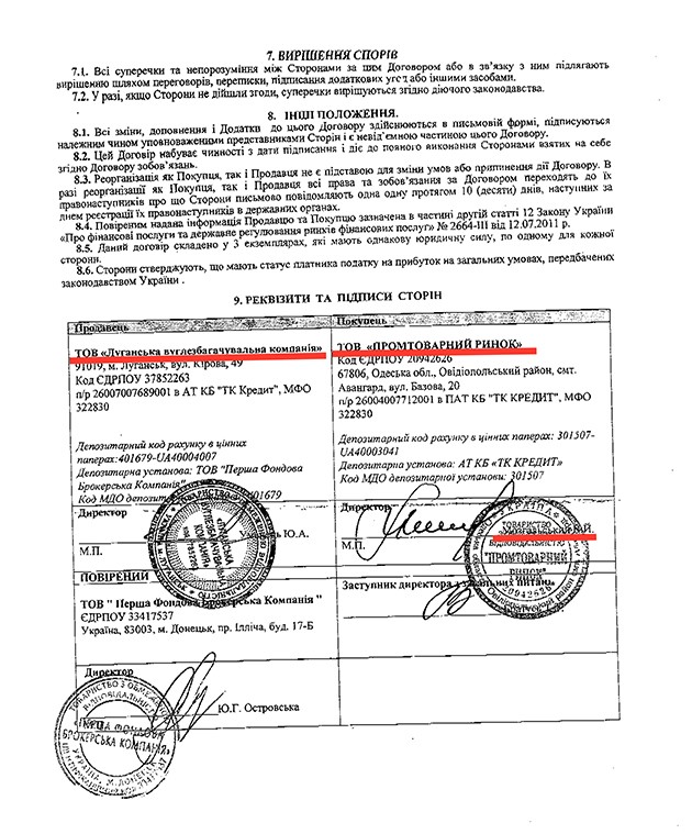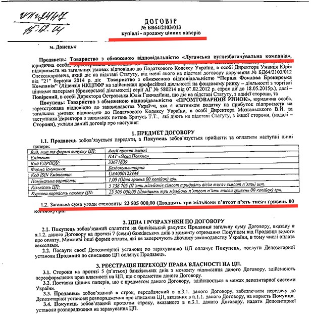 Однак усе це казуїстика. Звісно, ТОВ «Промринок» не могло перерахувати гроші «самопроголошеній освіті ЛНР». Згадані 23 мільйони 505 тисяч гривень було перераховано з рахунку ТОВ «Промтоварний ринок» на рахунок ТОВ «Луганська гірничозбагачувальна компанія» через банк «ТК Кредит», в якому перебували рахунки обох компаній, за рахунок оплати акцій ПАТ «Ясна поляна»: